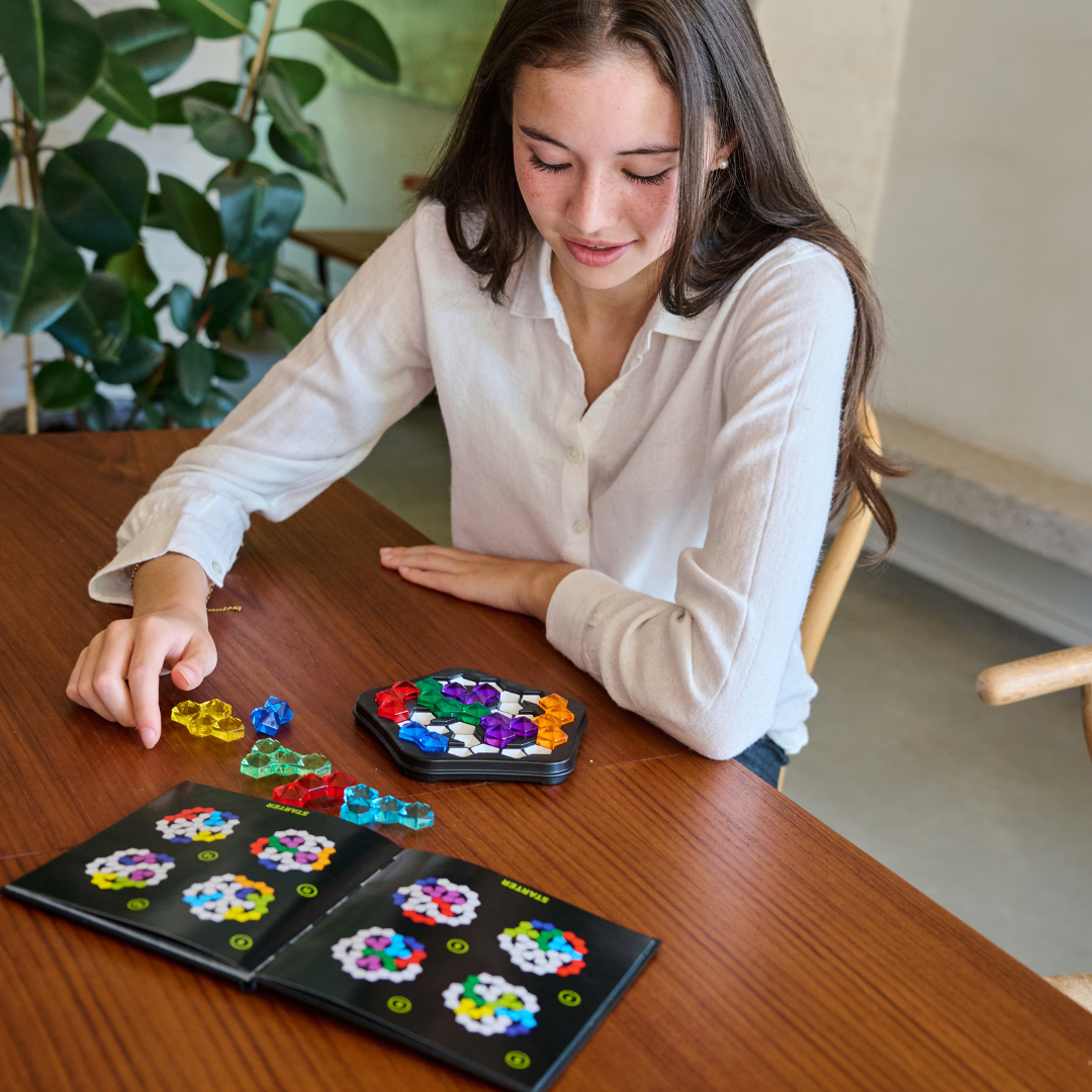 Odkryj prawdziwy klejnot wśród gier logicznych stworzony dla wymagających dorosłych. To ekskluzywne wydanie skrywa książeczkę ze 120 zadaniami, które zaintrygują nawet najbardziej wymagających miłośników łamigłówek. Czy potrafisz ułożyć wszystkie kolorowe elementy na tej zagadkowej, pięciokątnej planszy?