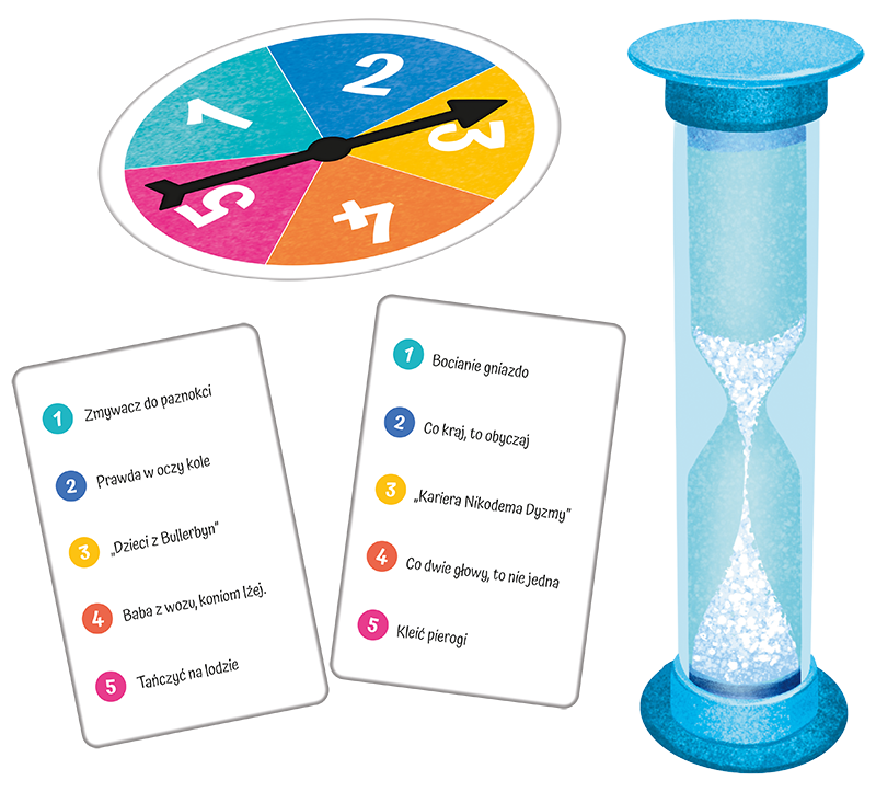 Rozgrywka działa podobnie jak tradycyjne kalambury, z tym że dodano kilka elementów, które czynią zabawę ciekawszą. Najpierw kręcicie kołem losującym, które wskazuje kategorię. Potem dobieracie kartę i staracie się pokazać lub opisać hasło, zanim piasek w klepsydrze przesypie się do końca. To właśnie tempo sprawia, że gra jest dynamiczna, a czasem także całkiem chaotyczna — ale w pozytywny, zabawny sposób.